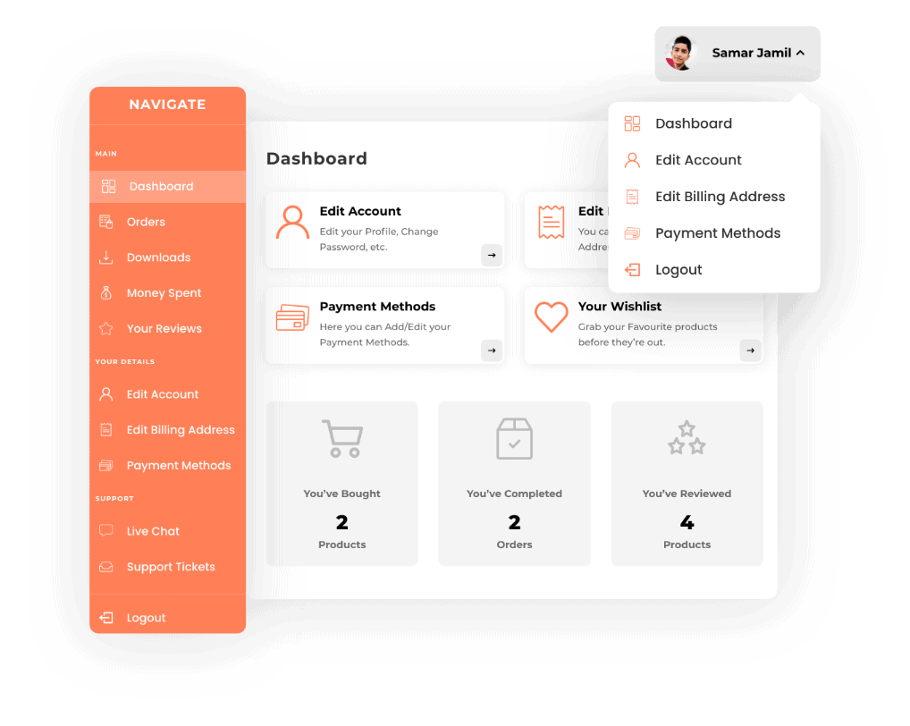 We always like to make sure that you get the Best Experience. That’s why the Molti Ecommerce brings a never before seen My Account Experience for WooCommerce that will blow your mind away. It has been Designed in a way that It looks like a busy Dashboard but It’s actually a clean & sleek My Account Page with so stunning Animations, Profile Card and Dropdown Menu.