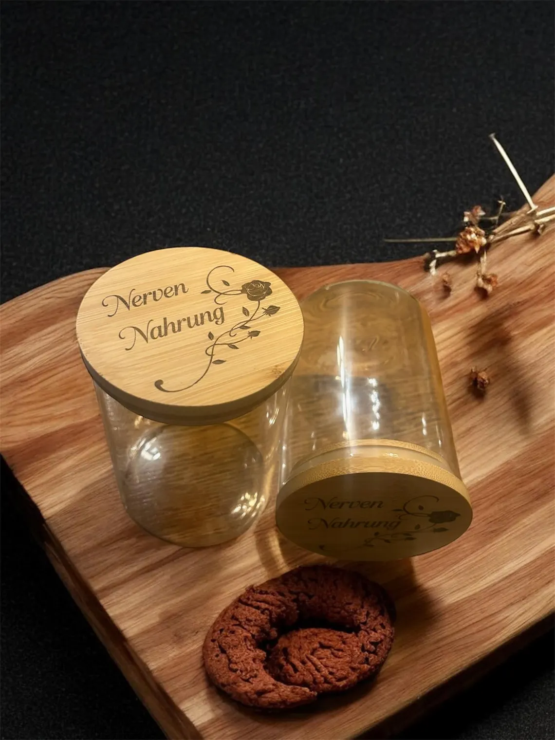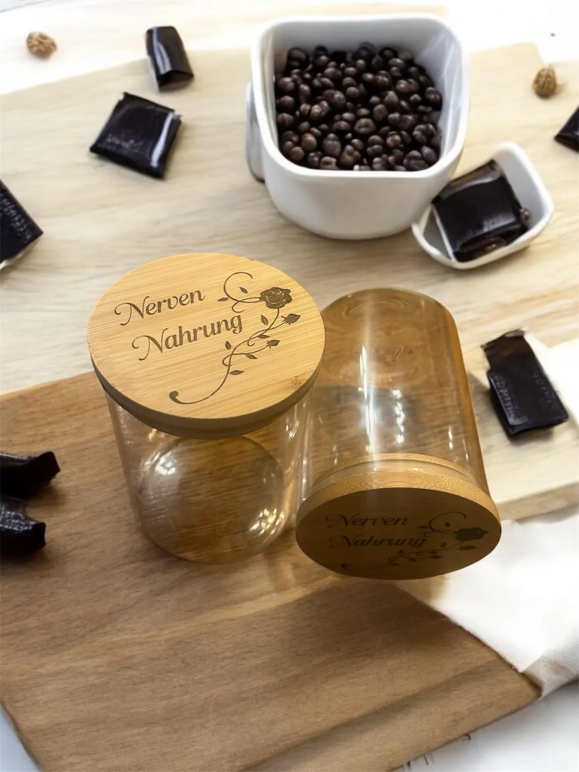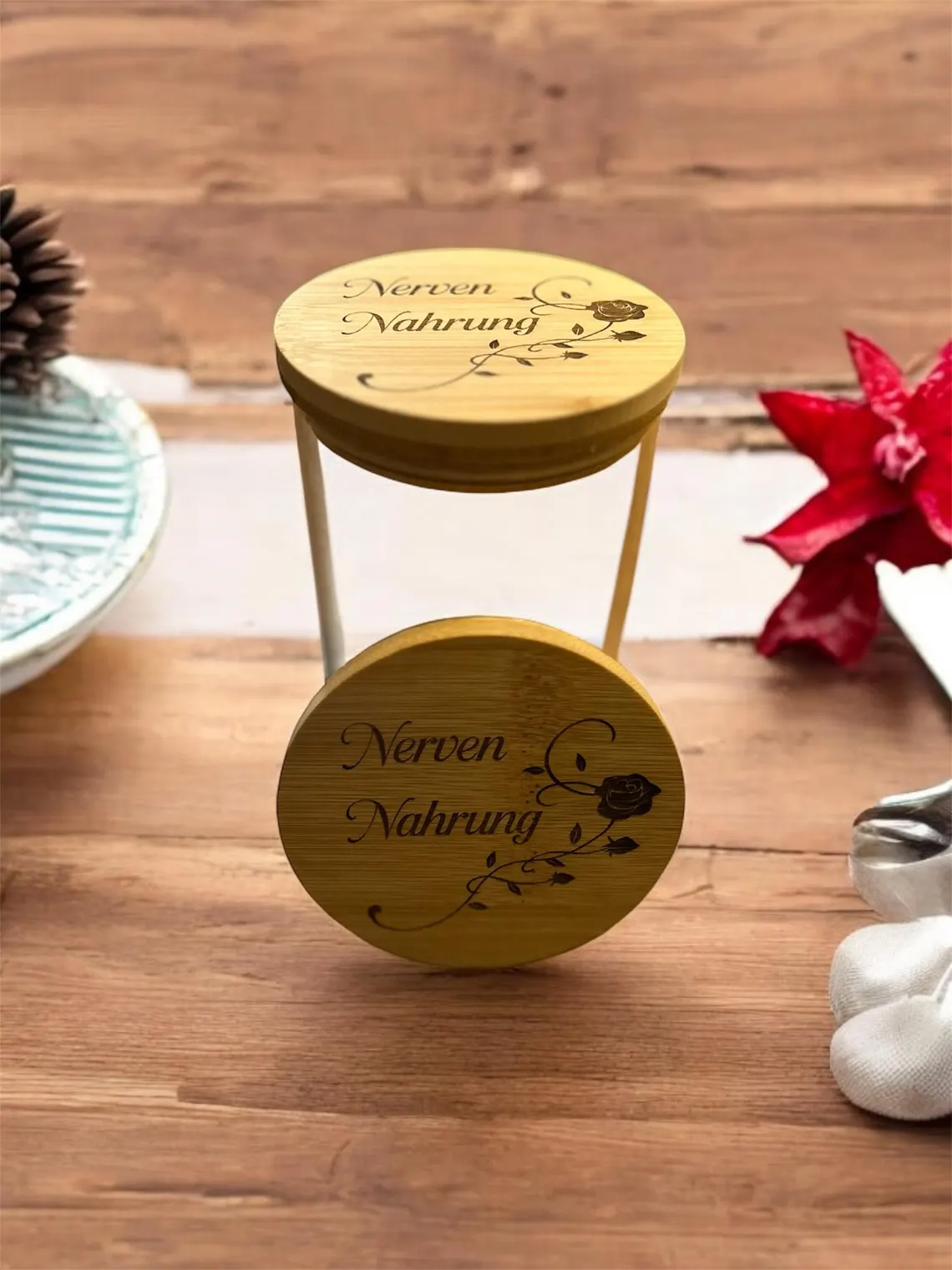 Dieser liebevoll gestaltete Behälter vereint Ästhetik und Funktionalität. Der Deckel aus nachhaltigem Bambus wird per Laser mit einem zarten Rosenmotiv und dem inspirierenden Schriftzug „Nervennahrung“ graviert ein perfektes Detail, das jedes Zuhause verschönert.