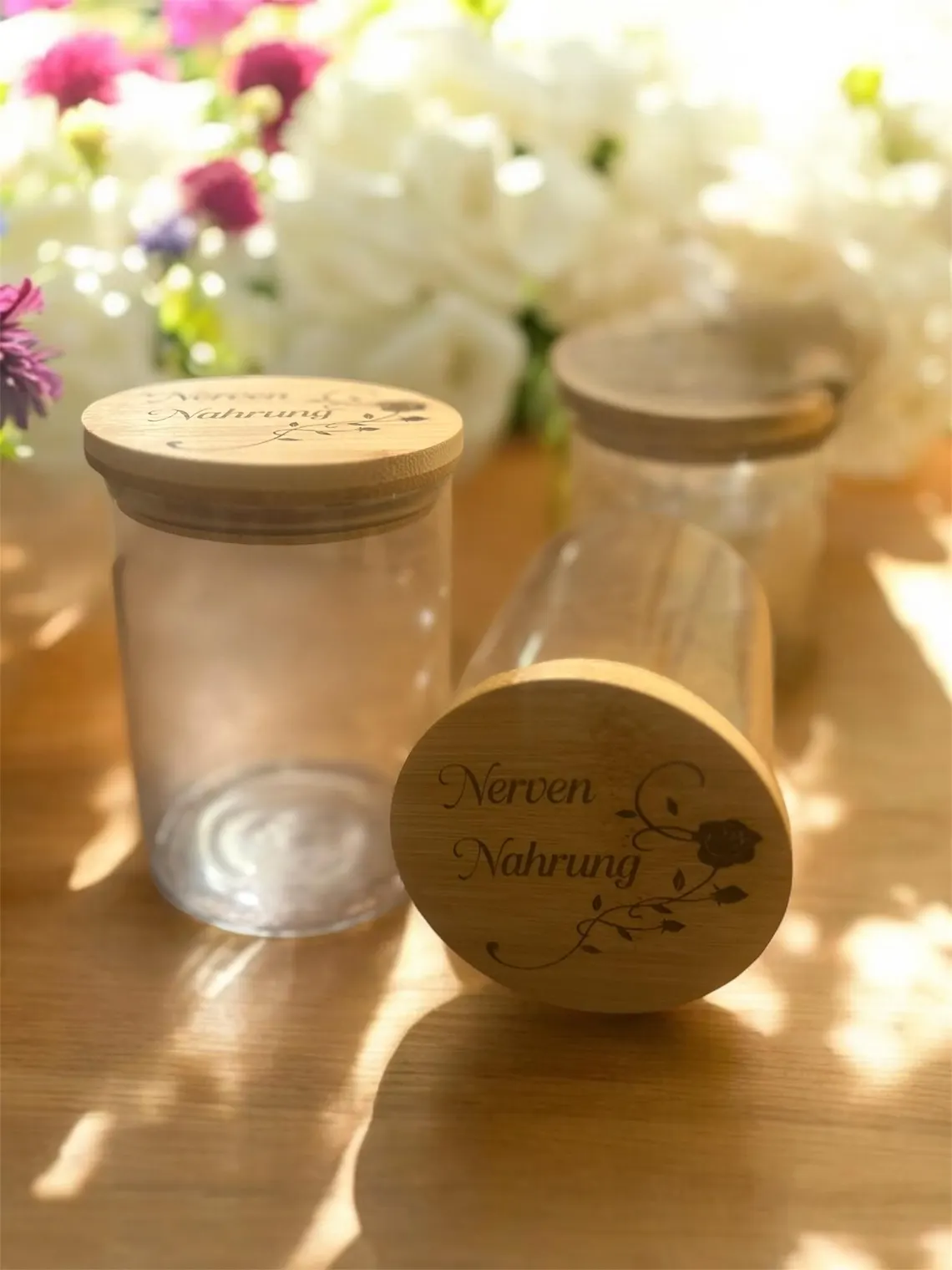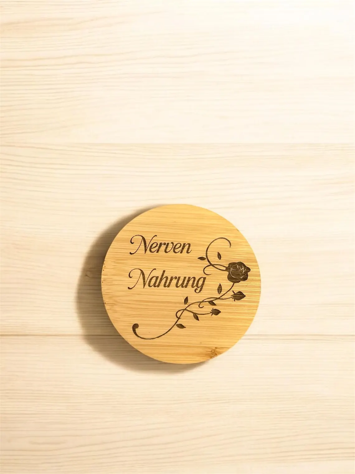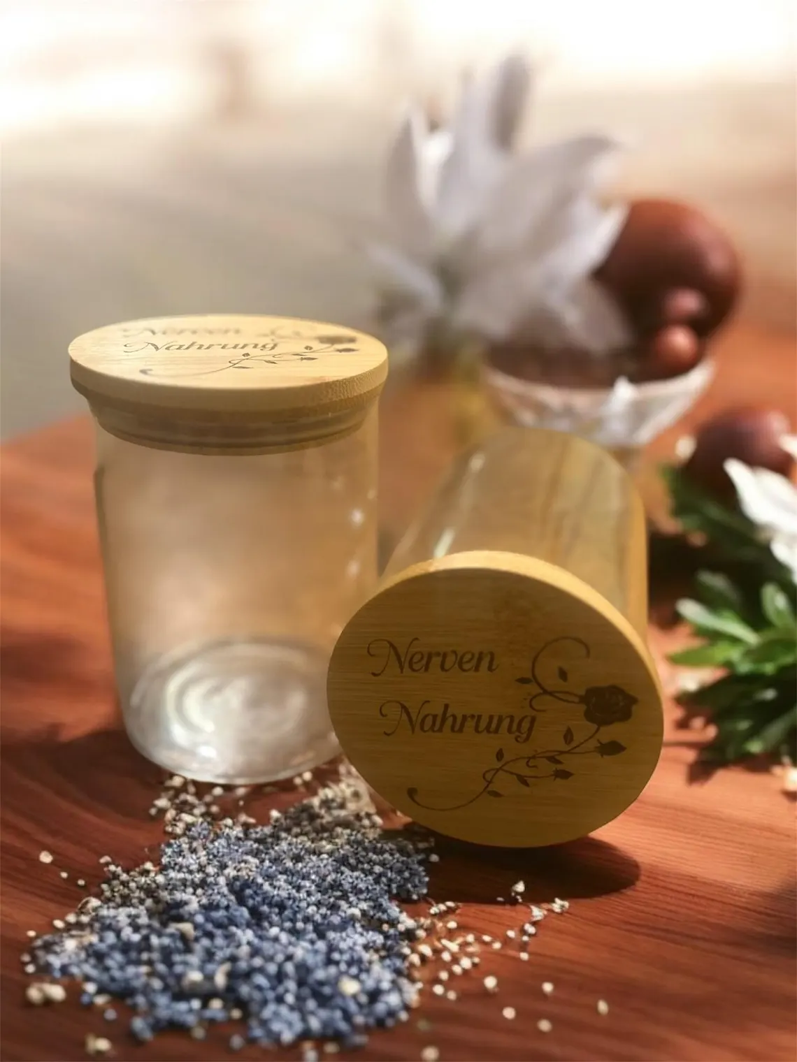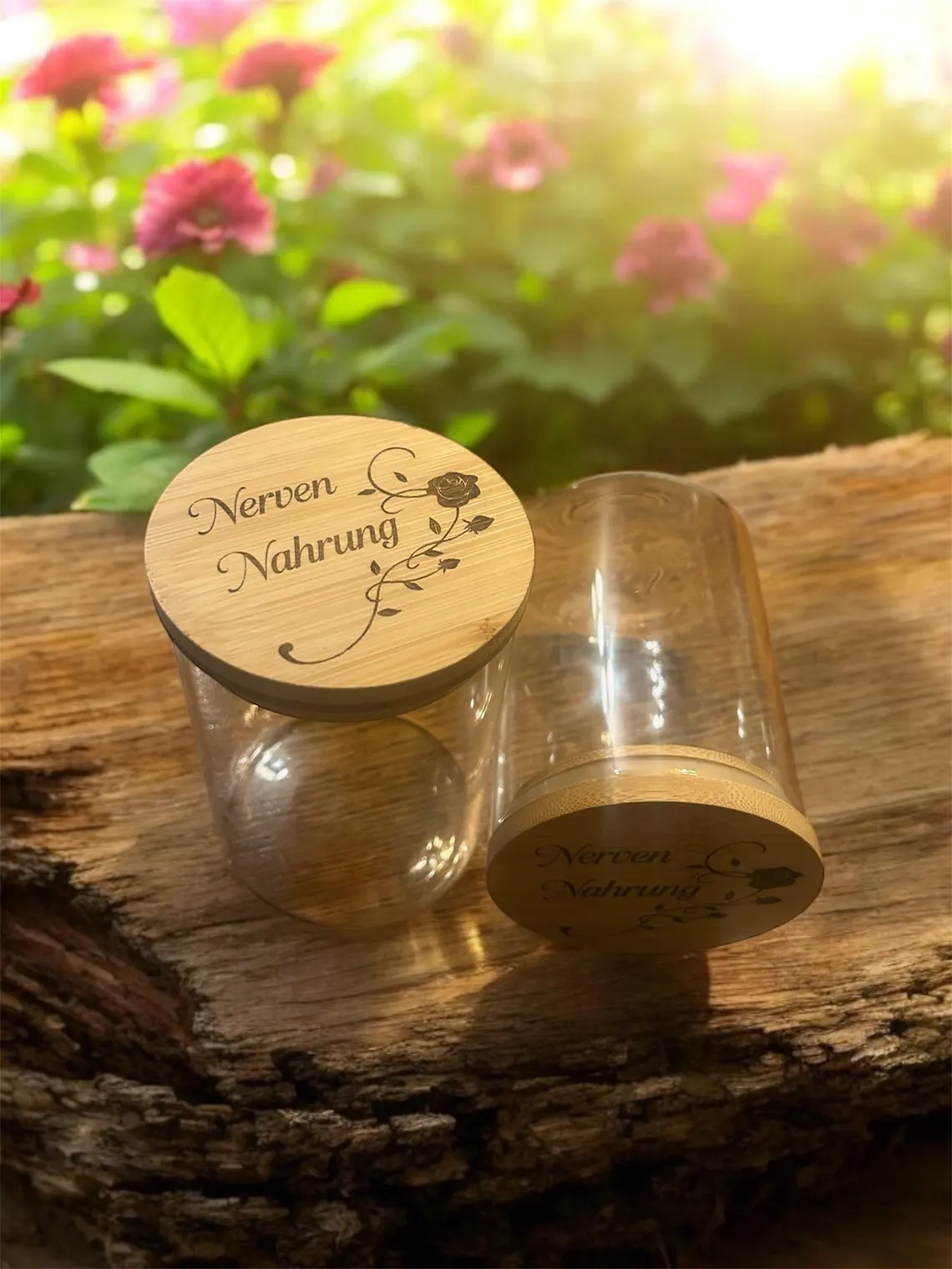 Dieser liebevoll gestaltete Behälter vereint Ästhetik und Funktionalität. Der Deckel aus nachhaltigem Bambus wird per Laser mit einem zarten Rosenmotiv und dem inspirierenden Schriftzug „Nervennahrung“ graviert ein perfektes Detail, das jedes Zuhause verschönert.